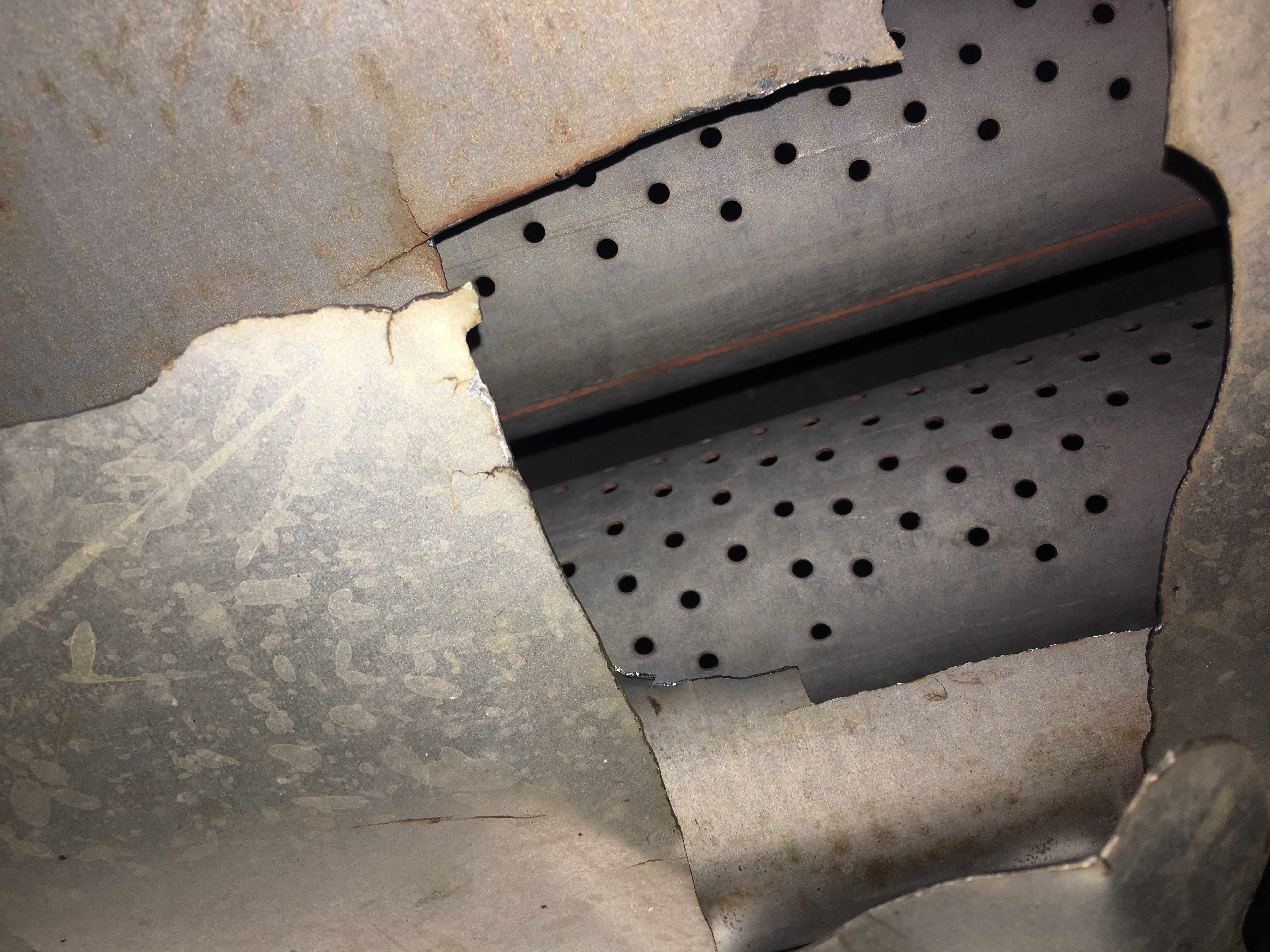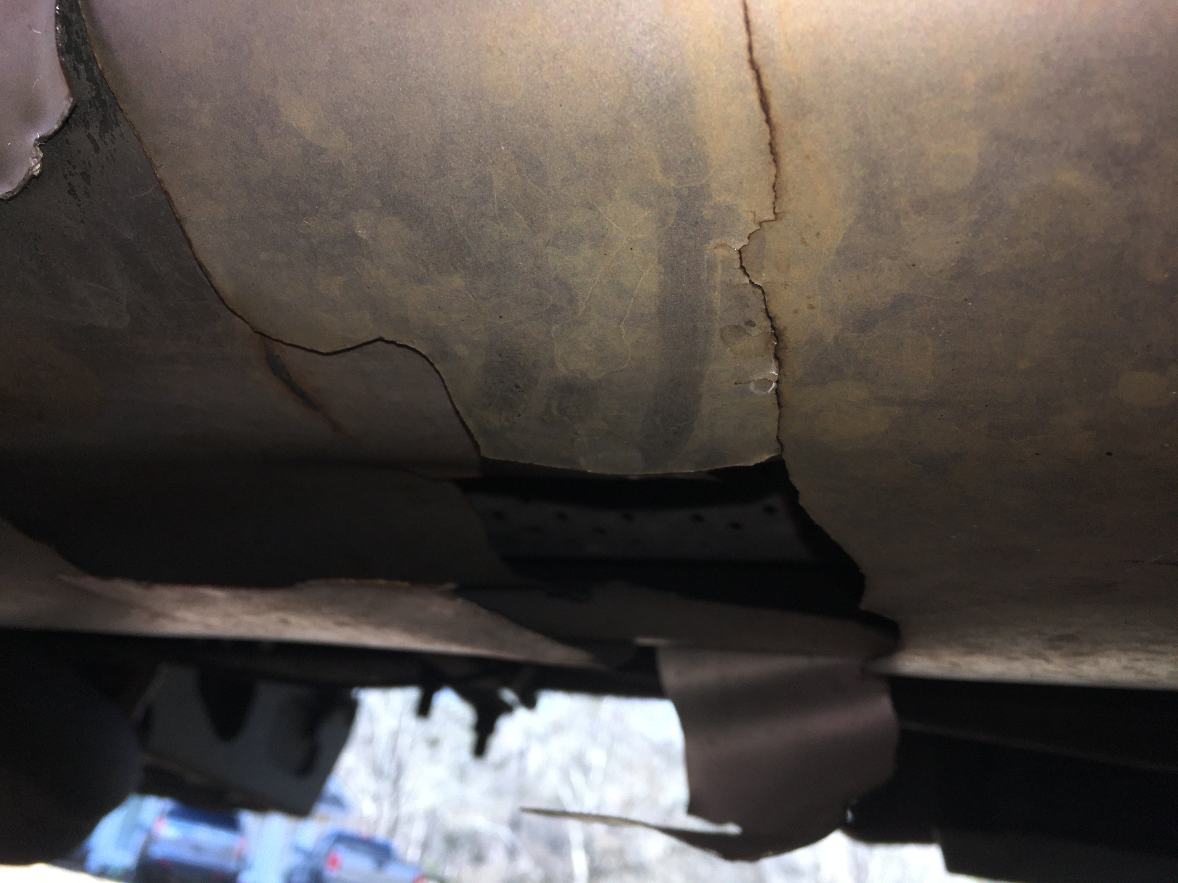 Nope, I cut a piece of that metal off to compare when I picked up the Isuzu muffler yesterday and folded that metal back. It really blew a hole through the bottom. Look at the crack marks where the metal was stressed from the heat and pressure. Coincidently, my mechanic was honest enough to admit he was at fault for choosing that muffler because he's currently replacing the same one on a newer box truck with the same engine.