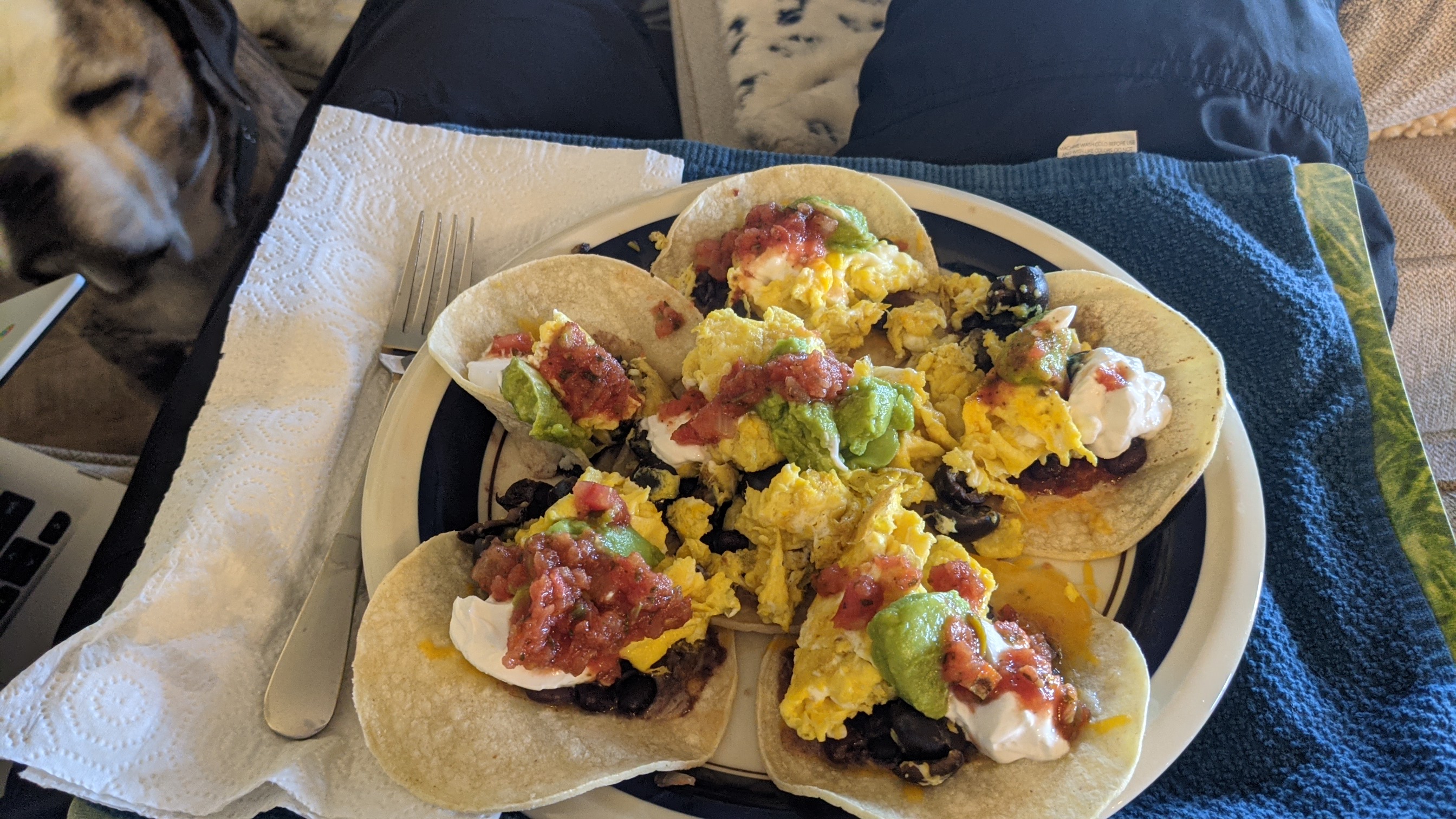With homemade guacamole, tortilla chips, queso fresco, chopped fresh tomatoes, finely chopped red cabbage, tomatillo salsa, with a cilantro/ lime Fresca, all on fresh white corn tortillas....