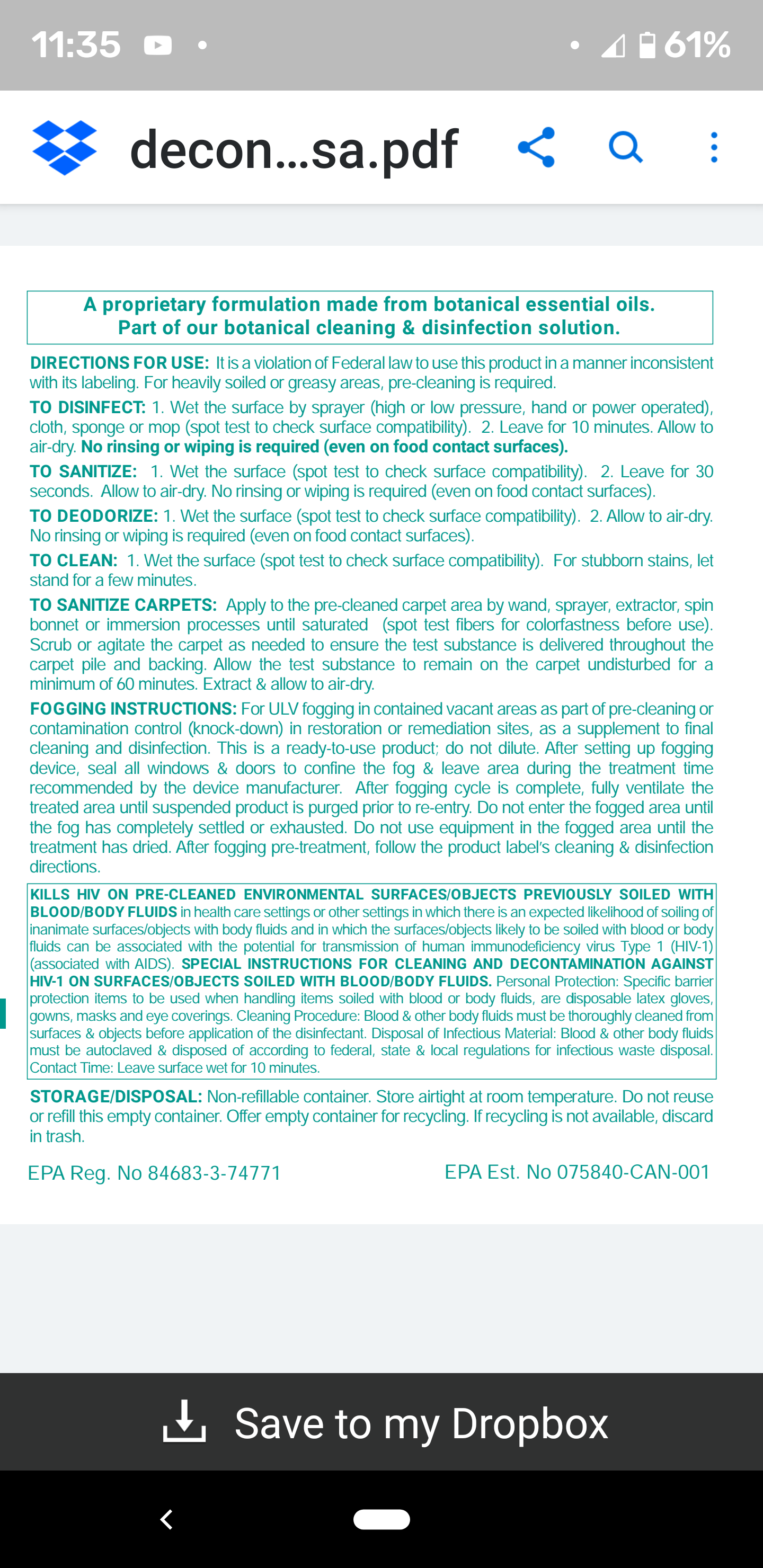 A product on the “N” list that is labeled for use as a sanitizer on carpet and upholstery, and that has a shorter duration than Mike is facing.